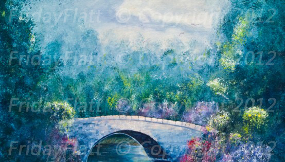 Garden Bridge: “Peace” acrylic on canvas 16”x20” original: $1250 giclee print on canvas 16×20 stretched gallery wrapped $650. matted giclee prints: 8×10: $75, 13×19:$125, 18×24: $225.