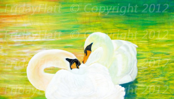 Swans: “Swan Lake” oil on line canvas 24”x30” original oil: $3500. giclee print on canvas 24”x30” stretched gallery wrapped: $1250. matted giclee prints: 8×10: $75, 13×19:$150, 18×24: $225